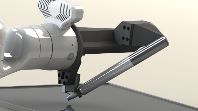 I wanted to improve the end effector to be more ergnonomic and maintain proper contact with the whiteboard/table. To do this I designed an end effector in Solidworks. The pen can move along its axis and is spring loaded. This way, the robot can be controlled to press into the table and consistently press out ink.