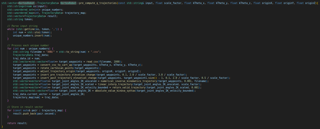 I then began working on a fully fledged trajectory generator given an array of cartesian positions. The trajectories I got were from a CODAMotion camera sensor, which provide 400Hz timestamped cartesian positions of a camera-tracked object. The function starts by taking in a csv of the trajectory points, transforming them so they start in the same spot, adding elevation changes so the manipulator moves down/up until it touches/leaves the surface, performing IK (this algo also accounts for singularities and discontinuities due to non-invertible Jacobians or position error non-convergence in finite number of iterations), adding a speed factor (linear interpolation) to slow down the trajectory (since Coda goes at 400Hz but Kinova runs at 1kHz so Kinova would try and run through points 2.5x faster), ensuring joint are within accel. and velocity limits using differentiation and adjusting the syntax to command joints to Kinova.