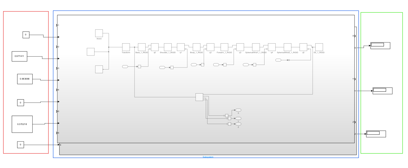 I implemented this method over my holiday break and so I couldn’t physically verify my code. Thank god for simulation, though. My strategy was to compare the inverse kinematic results from MATLAB Simulink’s built-in-tool to my C++ based implementation. If, for the same joint inputs I was getting the same cartesian outputs, it means that my IK was working!