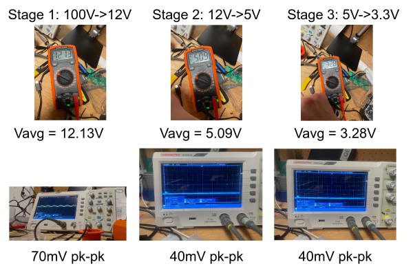 I used an oscilloscope to measure the output ripple for each stage. The LM5164 (12V) stage had much more ripple than i expected; about 70mV pk-pk. The other two stages were much smaller, around 40mV pk-pk.